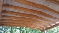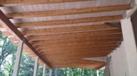 Copertura con tavolame abete maschiato mm 35 di prima qualità trattata con un particolare tipo di finitura sbiancata ottenuta in 2 passaggi. 1 Mano di antitarlo/antimuffa color casatagno più finitura a pennello con pittura murale diluita, spugnata e raschiata.